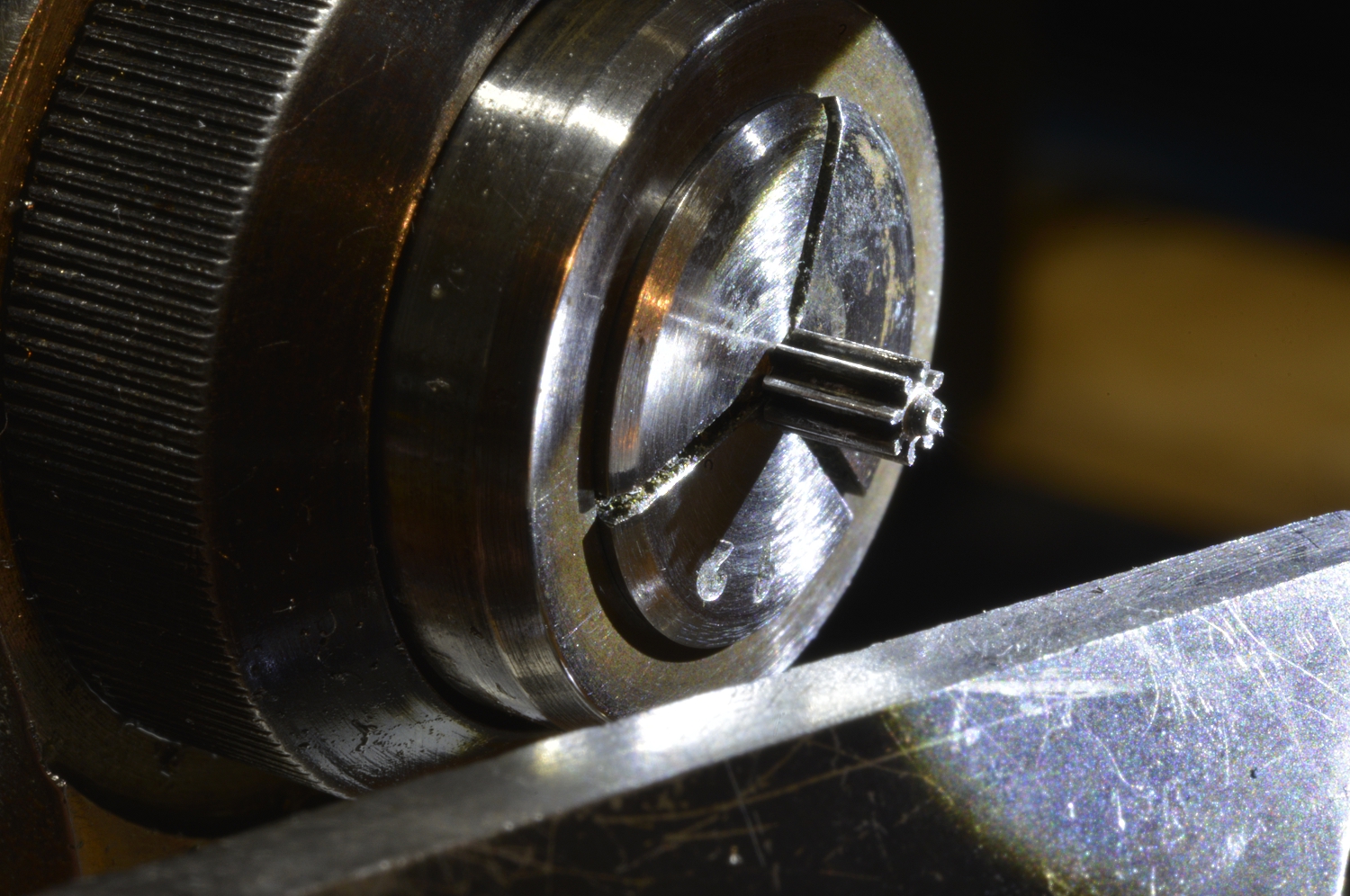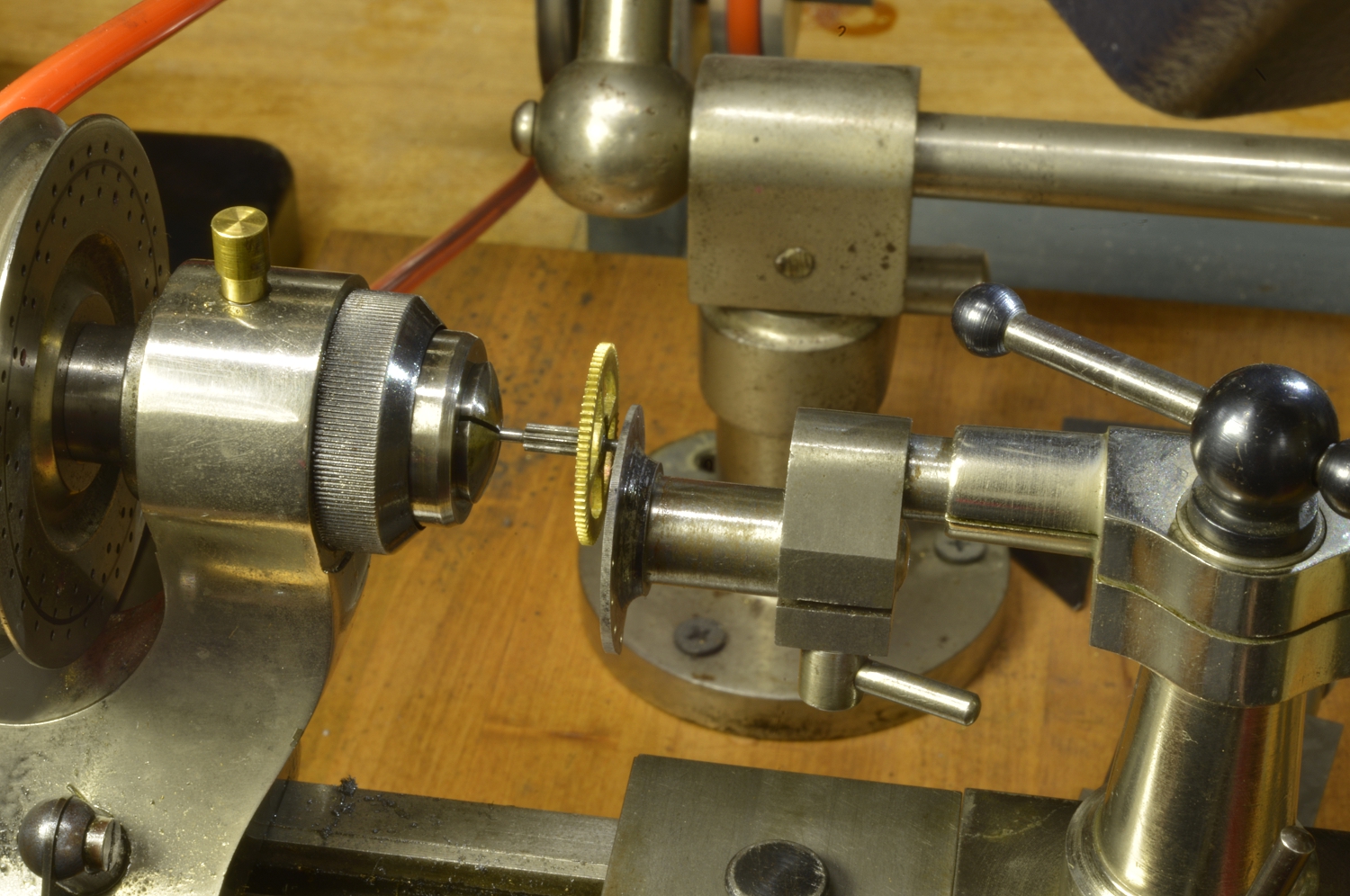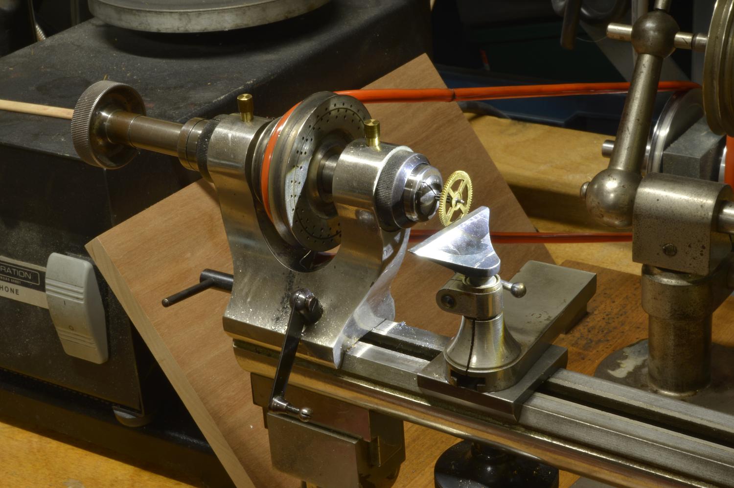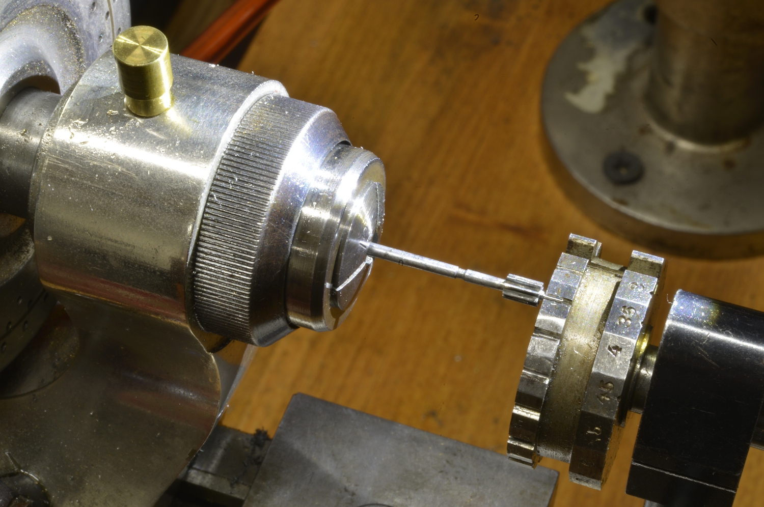 Every pivot needs to br burnished and polished. This special attachment, held in the tailstock, makes this easy as it supports the delicate pivot