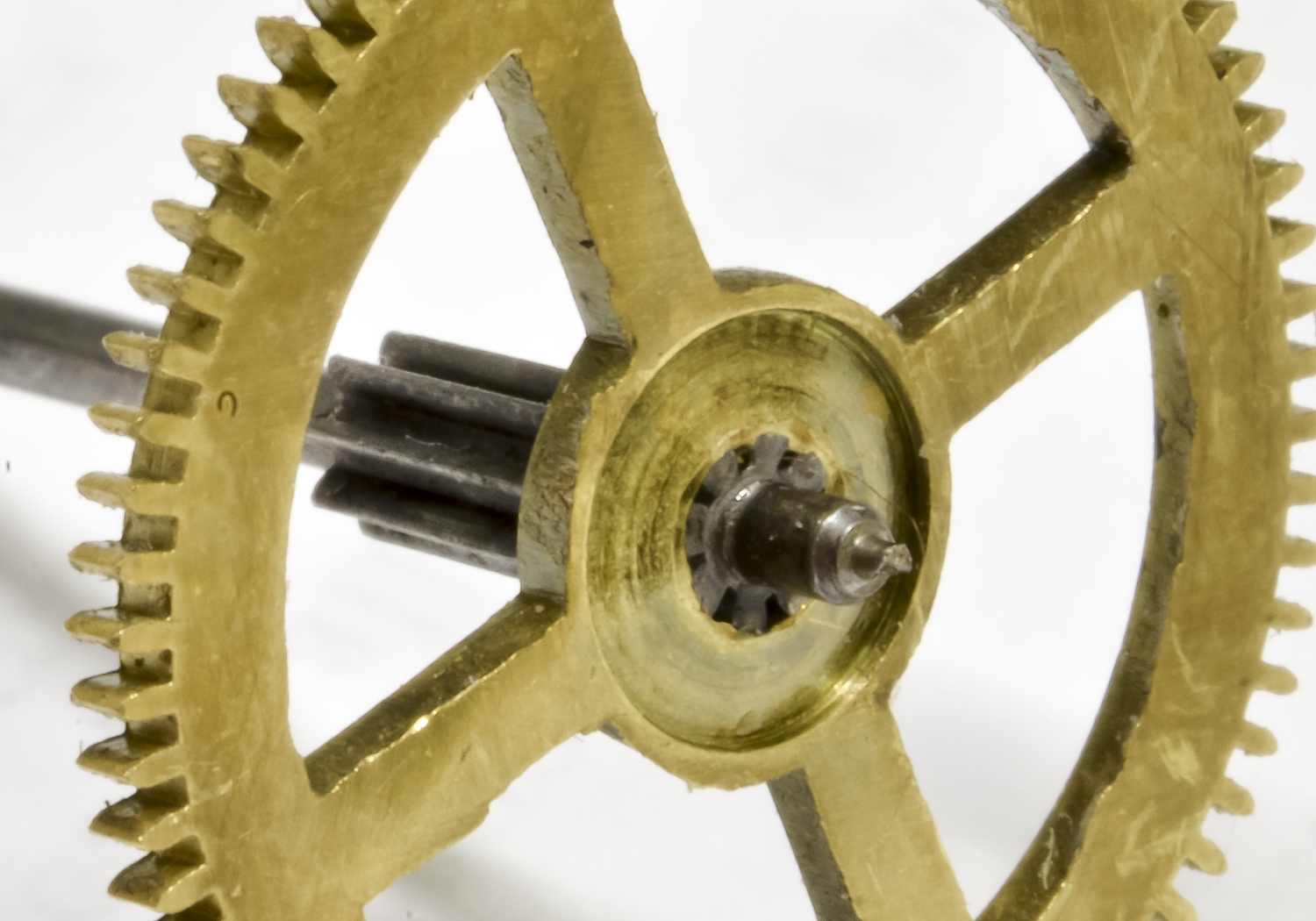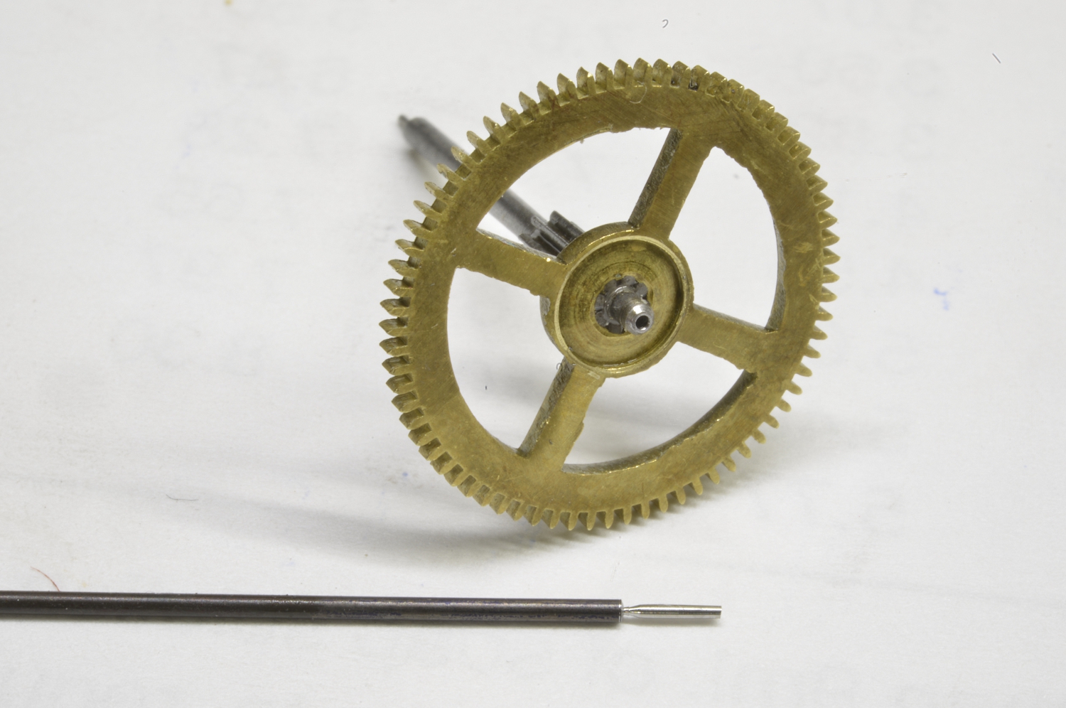 Here’s a little repair for a neat old 3 weight clock. The pivot on the fly arbour and also one on the connecting wheel was broken. The fly is kind of a governor that spins in the air and uses air resistance to regulate the speed of the strike mechanism – e.g. if the clock is to ring 5 times at 5 o’clock, you want the five strikes equally spaced.