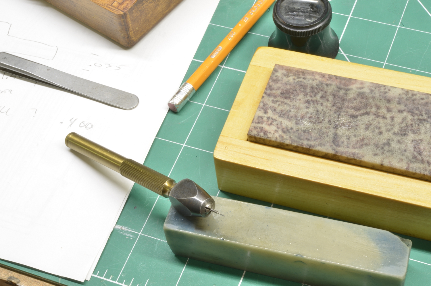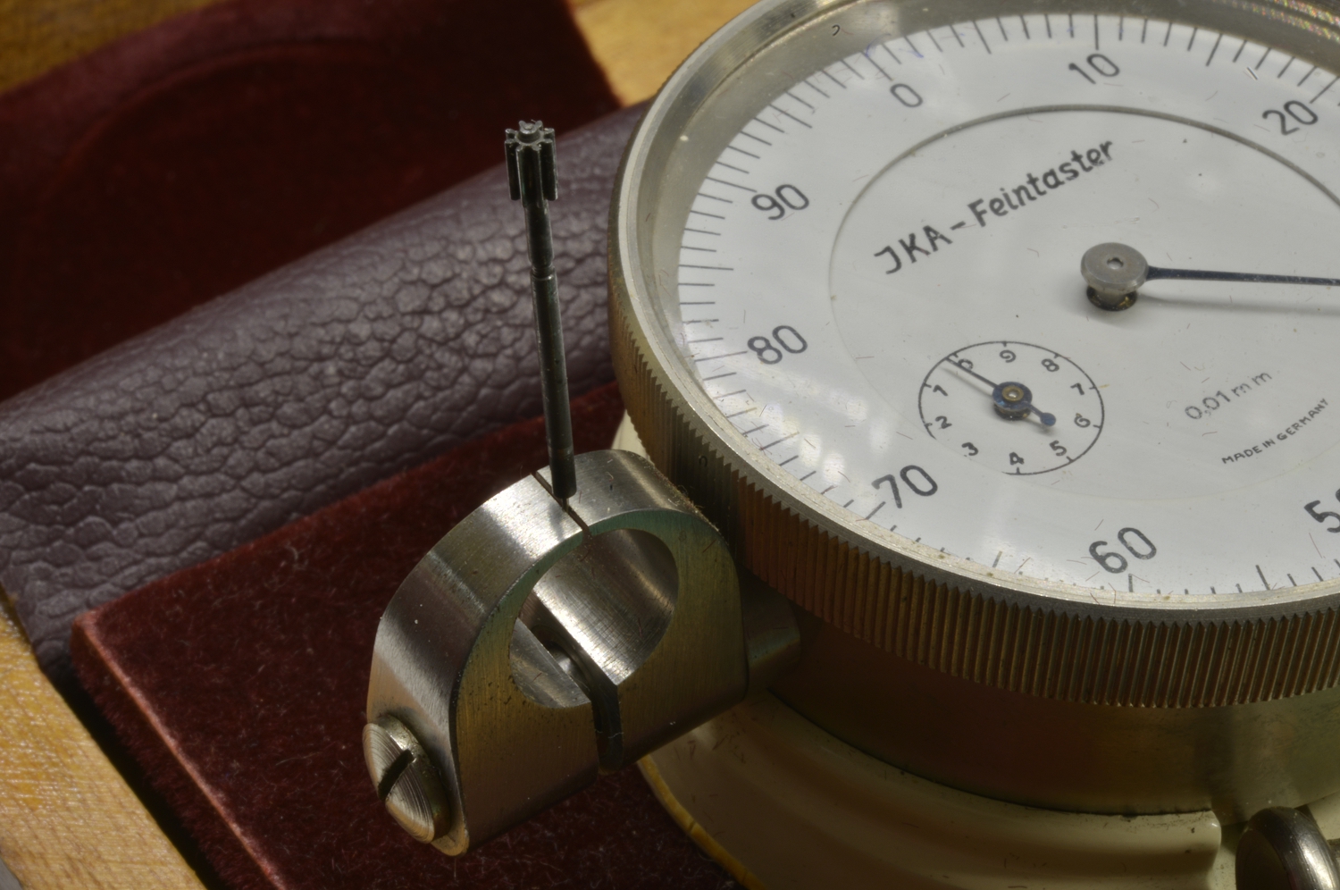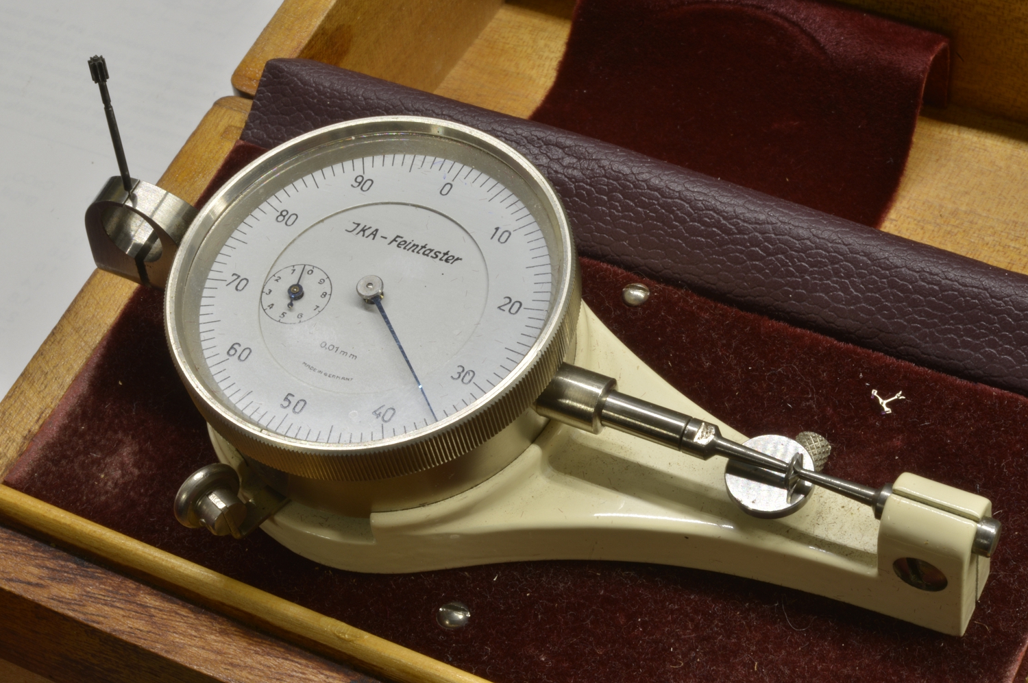 The measuring tool if you are not familiar is the wonderful Feintaster. A lever moves an indicator plunger that has a stage and special anvils on one end and a caliper jaw arrangement on the other.