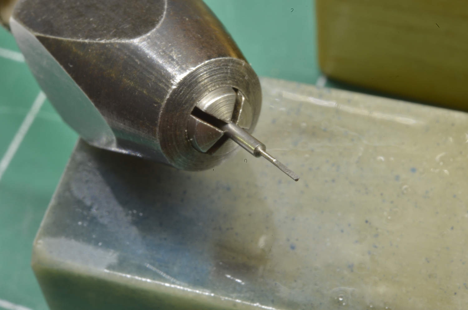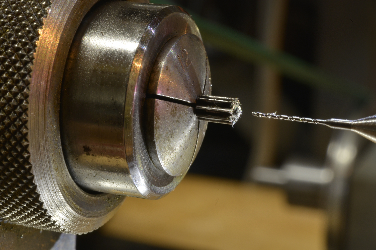 Turning the testing pivot from blue tempered tool steel.
